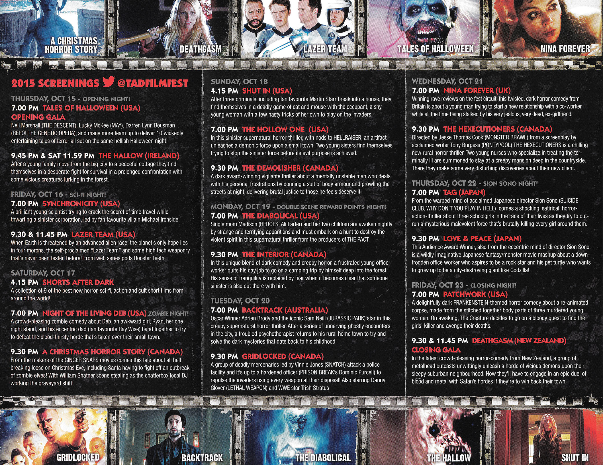 The 10th edition of Toronto After Dark Film Festival ran from Oct 15-23, 2015 at the Scotiabank Theatre located at 259 Richmond Street West. You can check the full schedule of films that screened here.